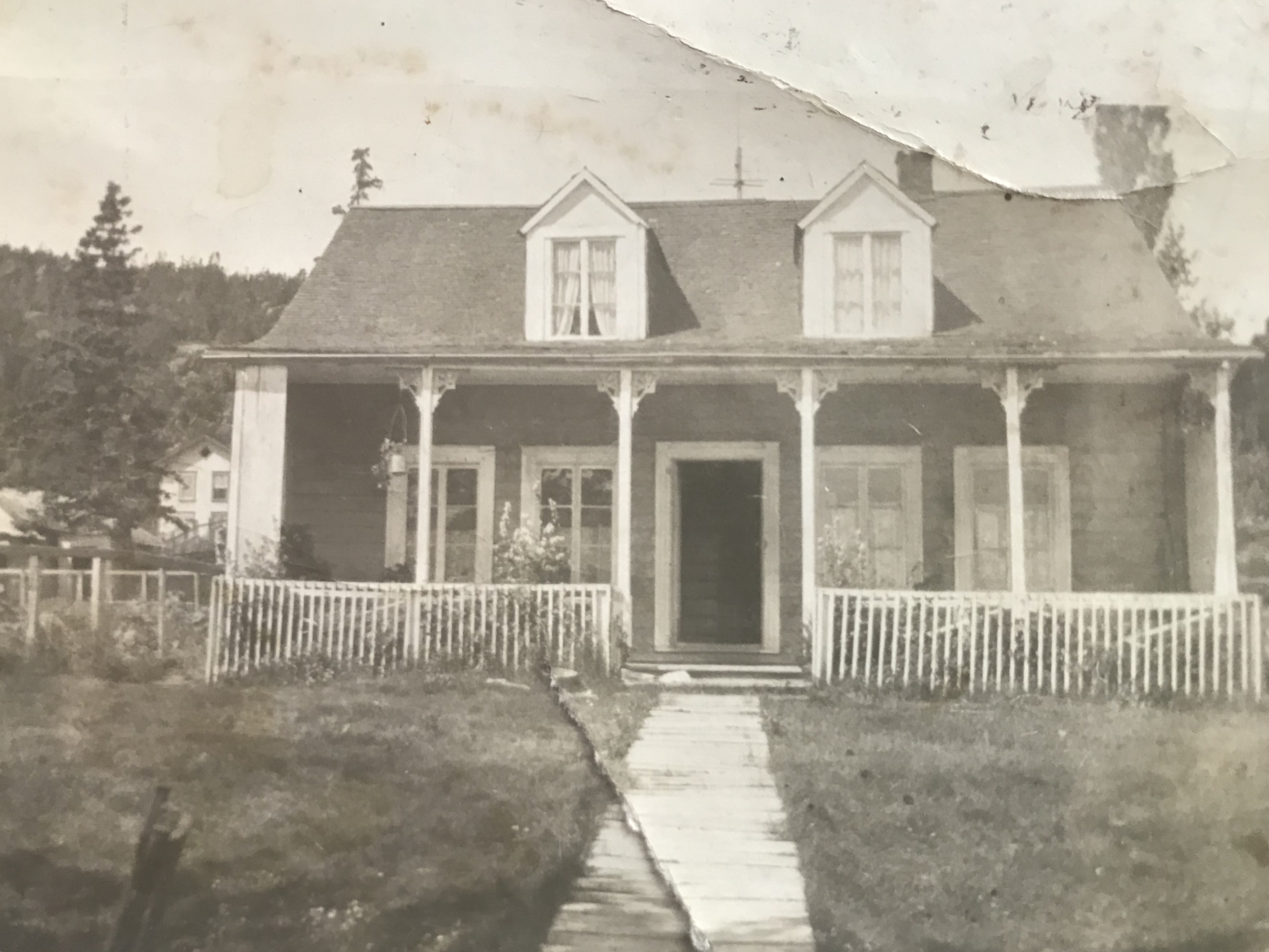 En 1903, Sarah Jourdain, mariée à Johnny Gauthier de Sacré-Coeur, (nos arrières-grand-parents) acquiert cette maison. Comme on peut le constater en regardant la photo ci-jointe, la maison d’un étage et demi a un toit à deux versants et deux lucarnes en façade.