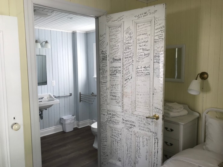 Toutes les pièces intérieures ont été revues. Trois nouvelles salles de bain ont été créées, dont une spécialement aménagée pour une personne en fauteuil roulant. Tous les planchers ont été refaits et mis à niveau. Une personne en fauteuil roulant peut maintenant circuler partout au rez-de-chaussée. Nous avons même conservé une porte intérieure qui tenait lieu de carnet de notes à notre tante Thérèse . Cette porte que l’on peut voir plus bas donne accès à la toilette pour personne handicapée au rez-de-chaussée.